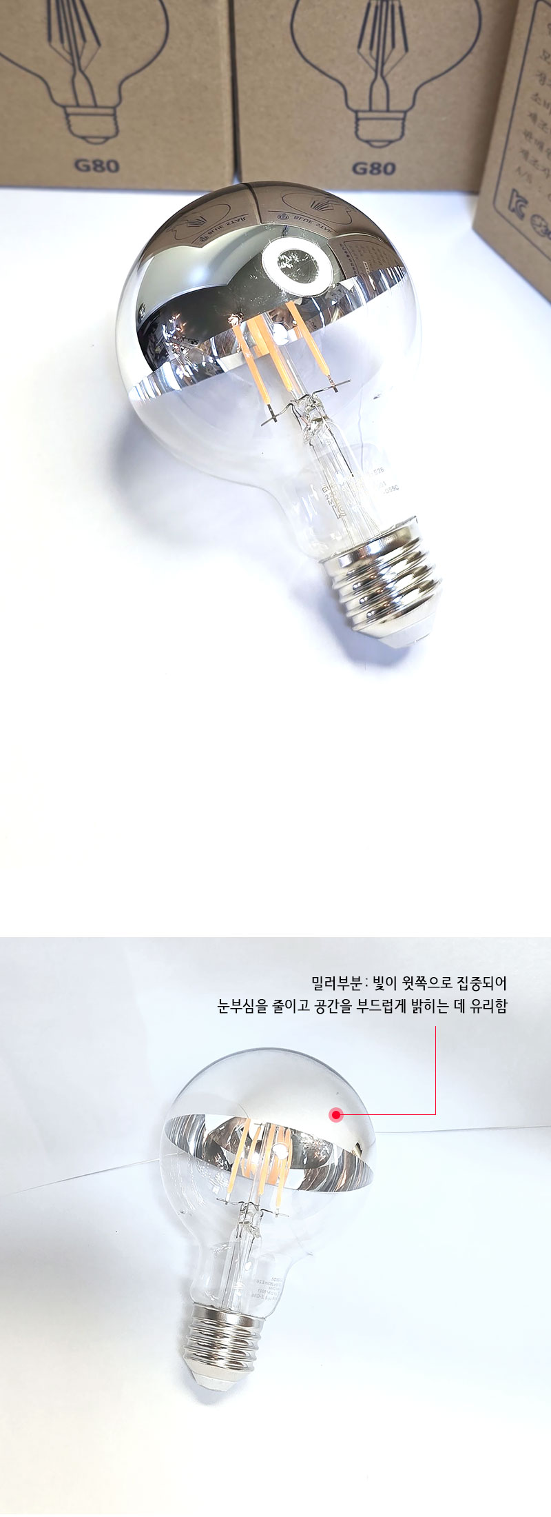전구 윗부분이 은색 반사 코팅 처리되어 있음.